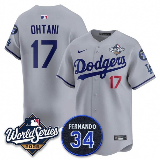 Men's Los Angeles Dodgers #17 Shohei Ohtani Gray 2025 World Series With No. 34 Limited Stitched Jersey