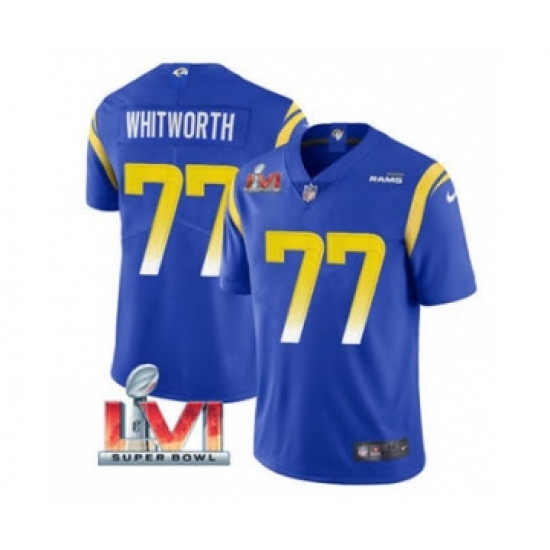>Men's Los Angeles Rams #77 Andrew Whitworth Royal 2022 Super Bowl LVI Vapor Limited Stitched Jersey
