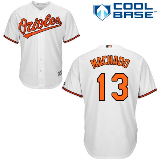Home>MLB>Baltimore Orioles>Manny Machado>Men's Majestic Baltimore Orioles #13 Manny Machado Replica White Home Cool Base MLB Jersey