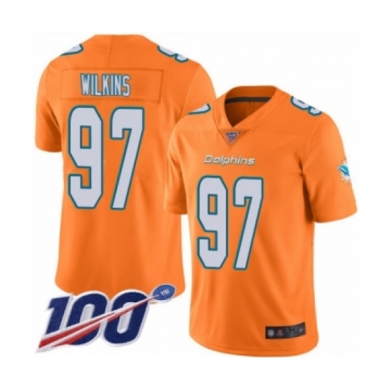 >Men's Miami Dolphins #97 Christian Wilkins Limited Orange Rush Vapor Untouchable 100th Season Football Jersey