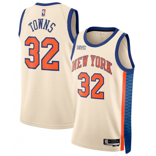 >Men's New Yok Knicks #32 Karl-Anthony Towns Cream 2025-26 City Edition Swingman Stitched Basketball Jersey