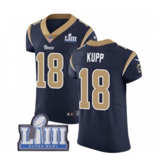 >Men's Nike Los Angeles Rams #18 Cooper Kupp Navy Blue Team Color Vapor Untouchable Elite Player Super Bowl LIII Bound NFL Jersey