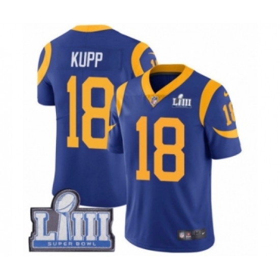 >Men's Nike Los Angeles Rams #18 Cooper Kupp Royal Blue Alternate Vapor Untouchable Limited Player Super Bowl LIII Bound NFL Jersey