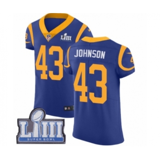 >Men's Nike Los Angeles Rams #43 John Johnson Royal Blue Alternate Vapor Untouchable Elite Player Super Bowl LIII Bound NFL Jersey