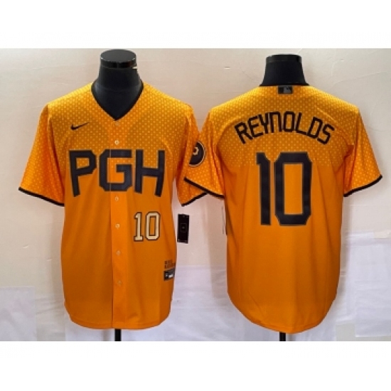 >Men's Nike Pittsburgh Pirates #10 Bryan Reynolds Number Gold 2023 City Connect Stitched Jersey2