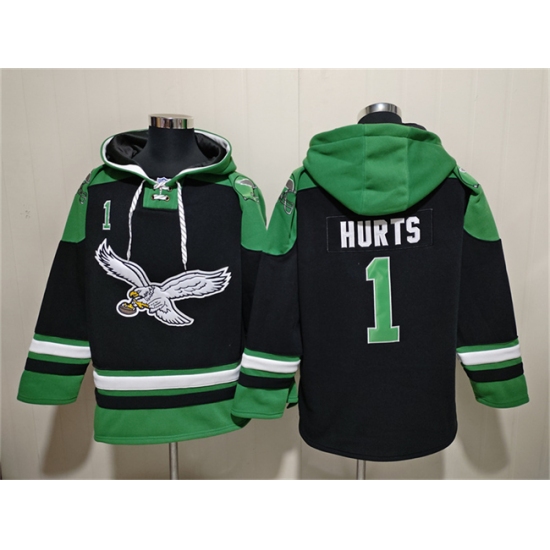 >Men's Philadelphia Eagles #1 Jalen Hurts Black Ageless Must-Have Lace-Up Pullover Hoodie