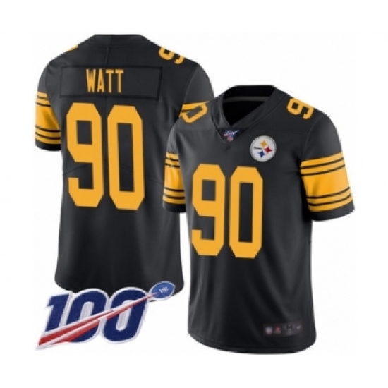 >Men's Pittsburgh Steelers #90 T. J. Watt Limited Black Rush Vapor Untouchable 100th Season Football Jersey