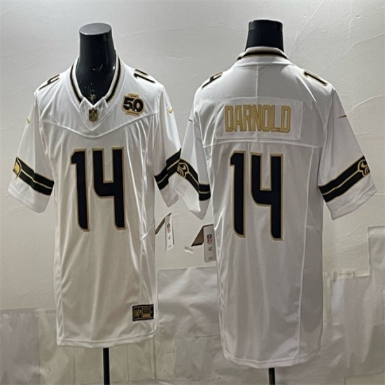 >Men's Seattle Seahawks #14 Sam Darnold White Gold 2025 F.U.S.E. 50th Season Vapor Limited Stitched Football Jersey