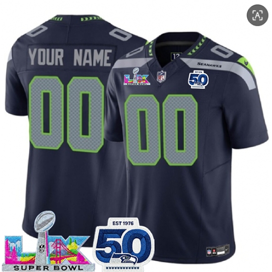 Men's Seattle Seahawks Active Player Custom Navy 2025 F.U.S.E. Super Bowl LX Patch And 50th Season Patch Vapor Limited Stitched Jersey