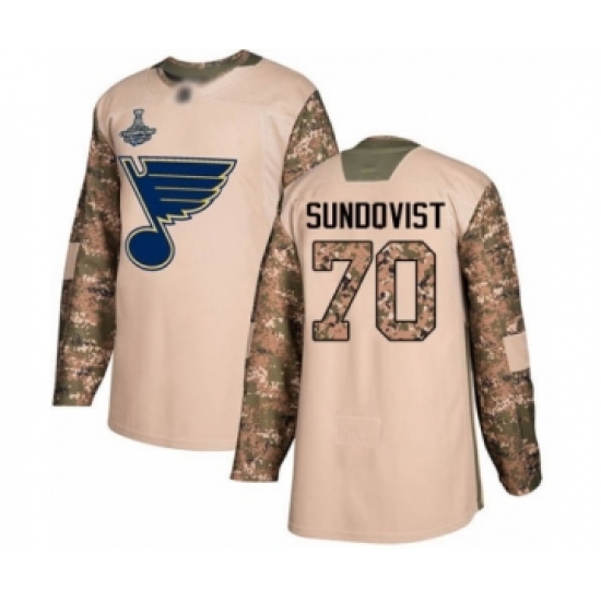 >Men's St. Louis Blues #70 Oskar Sundqvist Authentic Camo Veterans Day Practice 2019 Stanley Cup Champions Hockey Jersey