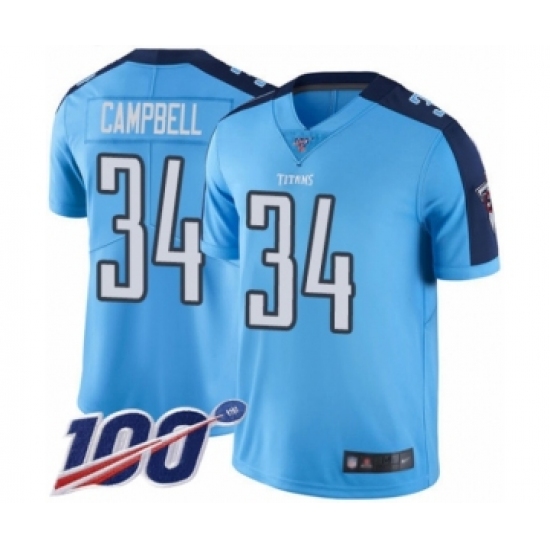 >Men's Tennessee Titans #34 Earl Campbell Limited Light Blue Rush Vapor Untouchable 100th Season Football Jersey