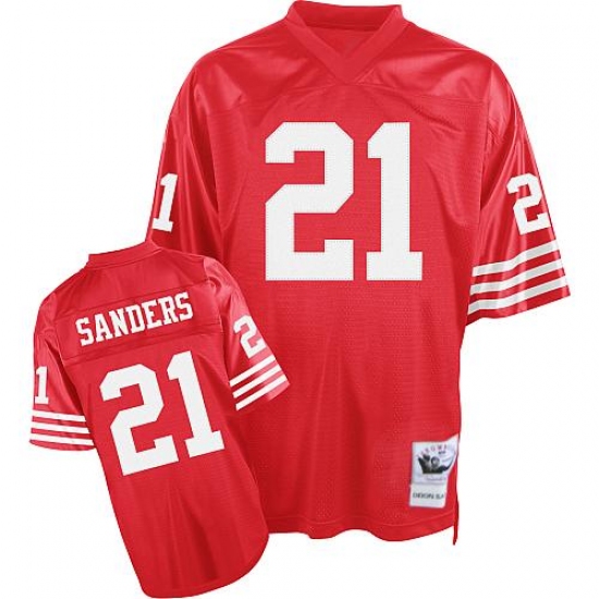 Feel like part of your favorite team by wearing this NFL® Mitchell and Ness San Francisco 49ers #21 Deion Sanders Authentic Red Team Color Throwback NFL Jersey, made of thick, high-quality Pro-Brite fabric for a genuine gridiron look. The players number which 100% stitched is displayed in tackle twill on the chest, back and sleeves, along with the team name on the front. The players name which 100% stitched is displayed on a sewn-down nameplate at the back. 100% Pro-Brite nylon and 100% Pro-Brite polyester for body, 100% lycratalic spandex dazzle for Side Panels/Collar/Cuffs, NFL® Equipment patch sewn on the bottom of the front collar or fabric insert, NFL® Equipment jock tag with numeric sizing is applied to the lower left bottom of the jersey, Reebok® logo embroidered on each sleeve, Officially licensed