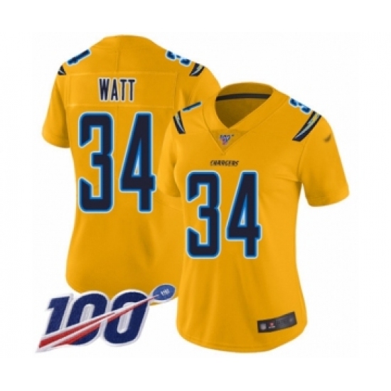 >Women's Los Angeles Chargers #34 Derek Watt Limited Gold Inverted Legend 100th Season Football Jersey