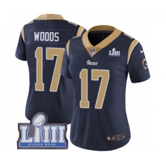 >Women's Nike Los Angeles Rams #17 Robert Woods Navy Blue Team Color Vapor Untouchable Limited Player Super Bowl LIII Bound NFL Jersey