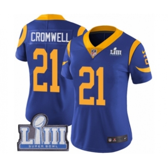 >Women's Nike Los Angeles Rams #21 Nolan Cromwell Royal Blue Alternate Vapor Untouchable Limited Player Super Bowl LIII Bound NFL Jersey