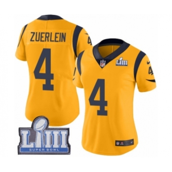>Women's Nike Los Angeles Rams #4 Greg Zuerlein Limited Gold Rush Vapor Untouchable Super Bowl LIII Bound NFL Jersey