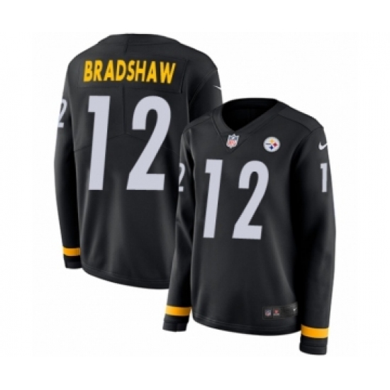 >Women's Nike Pittsburgh Steelers #12 Terry Bradshaw Limited Black Therma Long Sleeve NFL Jersey