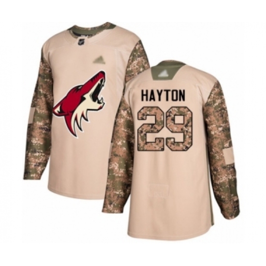 >Youth Arizona Coyotes #29 Barrett Hayton Authentic Camo Veterans Day Practice Hockey Jersey