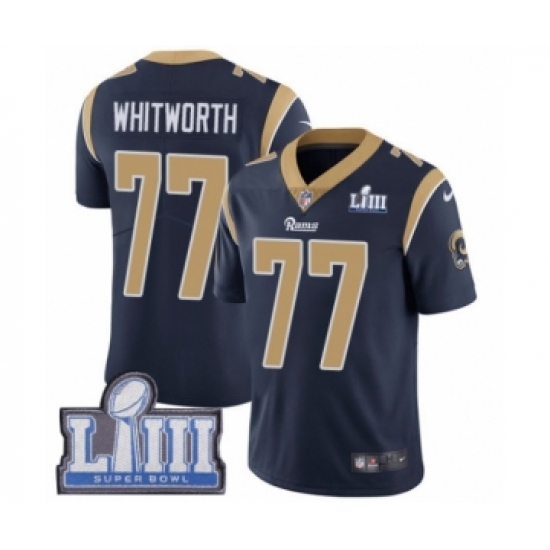 >Youth Nike Los Angeles Rams #77 Andrew Whitworth Navy Blue Team Color Vapor Untouchable Limited Player Super Bowl LIII Bound NFL Jersey